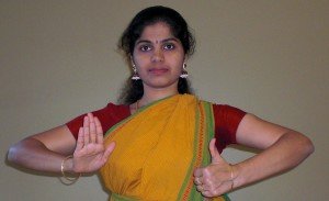 Varuna is represented by holding Pataka hasta in the right hand and Shikhara hasta in the left hand.