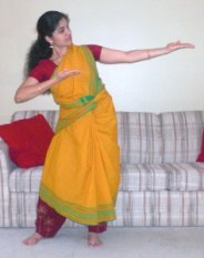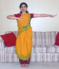 2. Begin with the right hand side. Bring your right hand close to the chest. Left hand is still in Natyarambhe. Palms are in Pataka hasta facing up (Uttana position of palms). Lift the right feet and place it one foot further to the right. Say Tai.